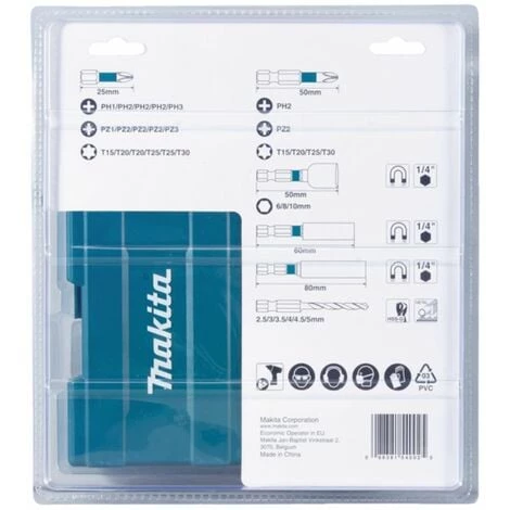 Makita Jeu de forets 33 parties Incidence des bits noirs sont caractérisés par des pointes qui sont fabriqués dans une grande précision et assurent un ajustement optimal de la tête de vis. Le bit est réalisé en acier fortement allié et S2 fournit le traitement thermique supplémentaire, une durée de vie plus longue et une résistance mécanique plus élevée.